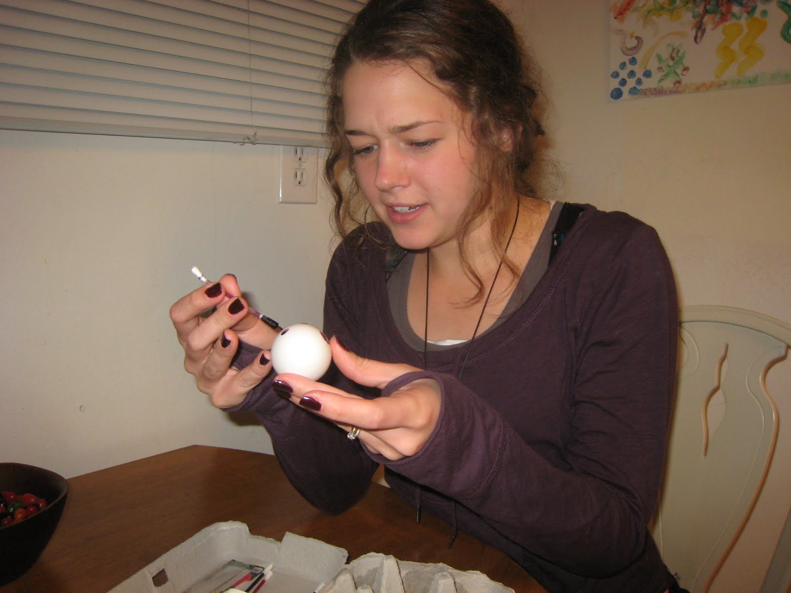 i did, actually, go to the bathroom, which currently has no light because something is wrong with our electricity. so i turned the kitchen light on to brighten it up in there. that also gave me enough light to take the bowl of chocolate eggs and hide them around our tiny living room. the door to our bedroom was open, and i was quite afraid that aaron would wake up and, yet again, curiously ask me what i was doing (or be creeped out that i was sneaking around the living room). so with a few eggs hidden, i got back into bed and slept for 2 more hours.